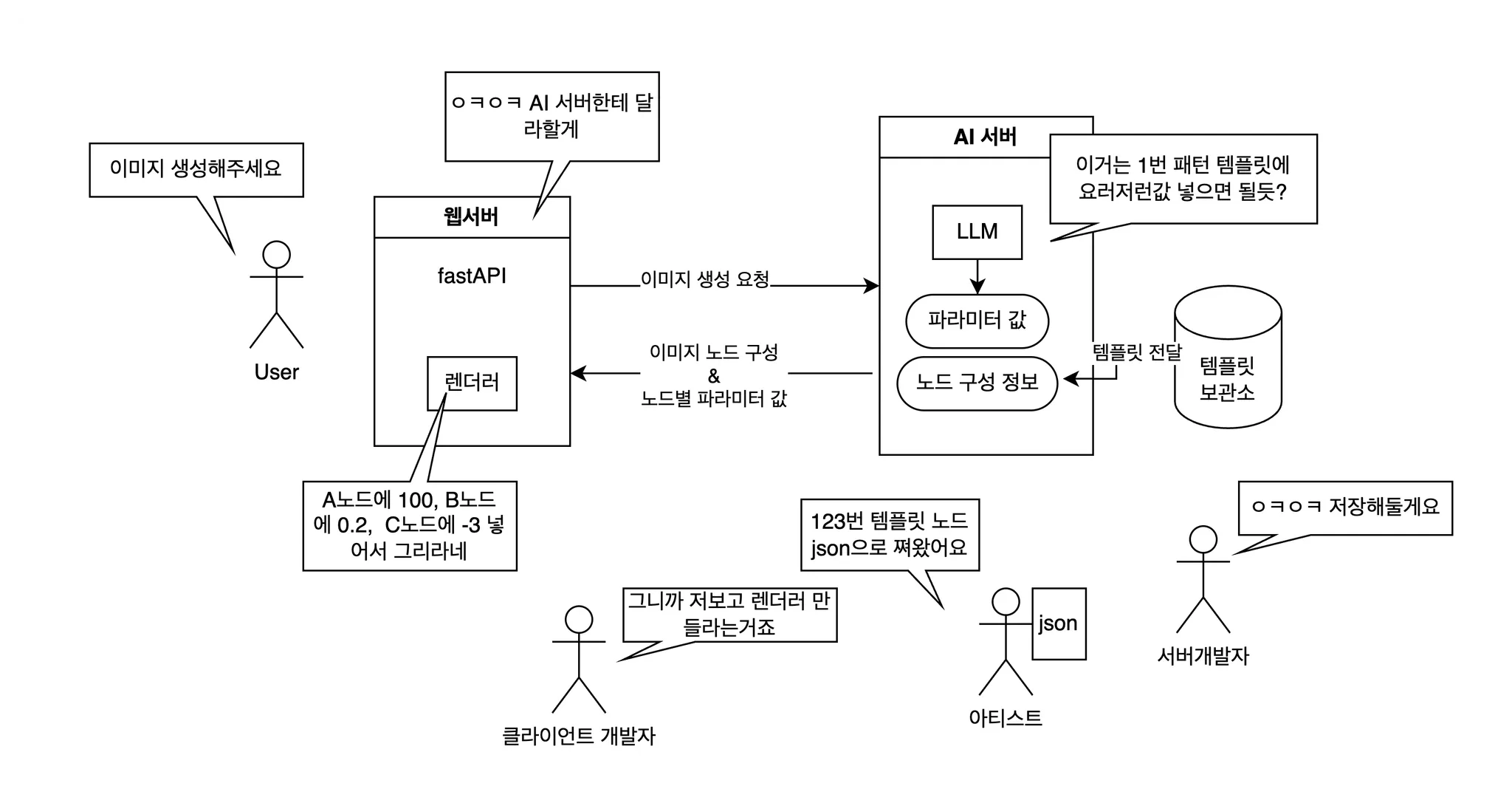 - 클라이언트는 받은 템플릿과 파라미터를 바탕으로 Canvas/WebGL/Three.js 등으로 실시간으로 이미지를 렌더한다.