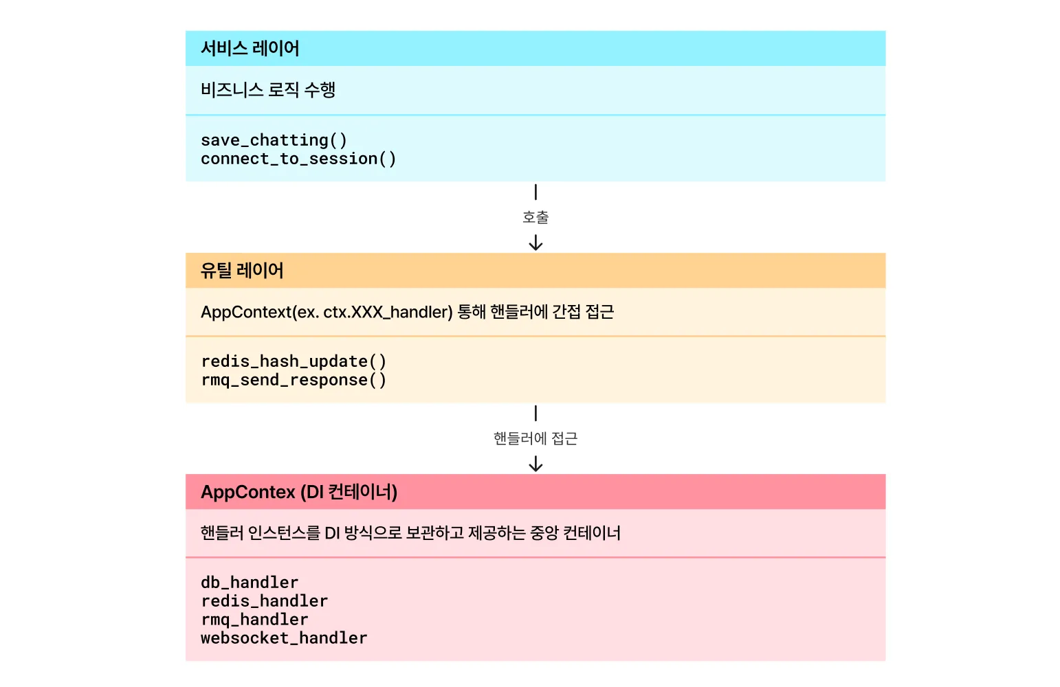 현재 서버는 DB, Redis, MQ, WebSocket 등의 주요 기능을 AppContext 기반으로 통합 관리하고, 서비스 로직에서는 이를 유틸리티 레이어를 통해 일관되게 호출하는 구조를 채택하고 있다.