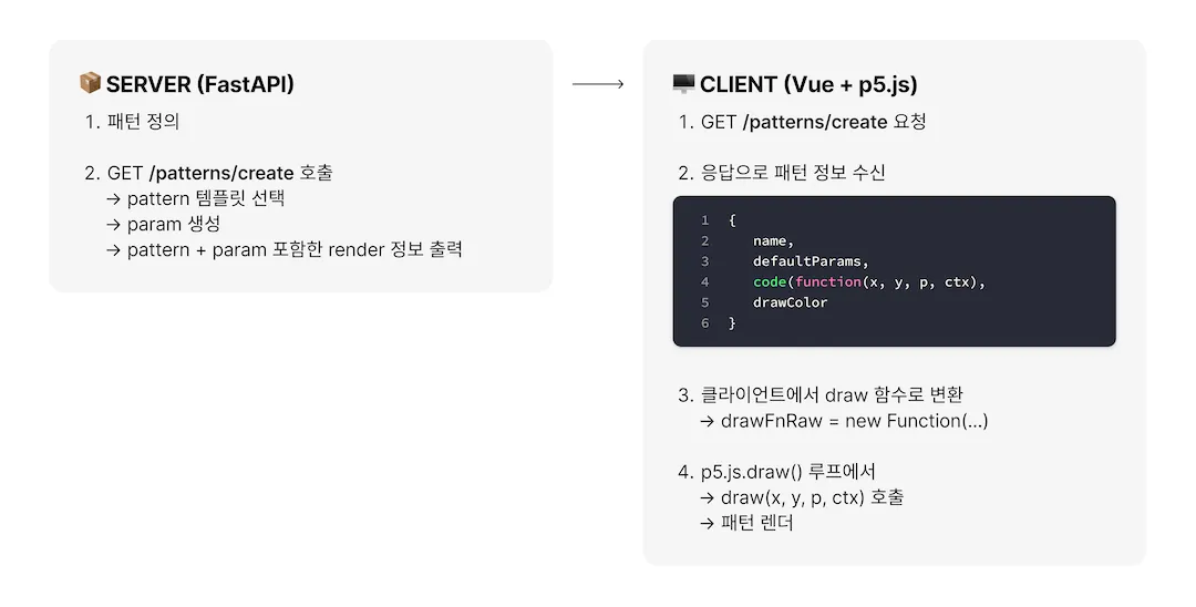 2. 서버는 /v1/patterns/create 요청을 받으면, 템플릿 + 파라미터 + 렌더링 코드(JS 문자열)를 내려준다.