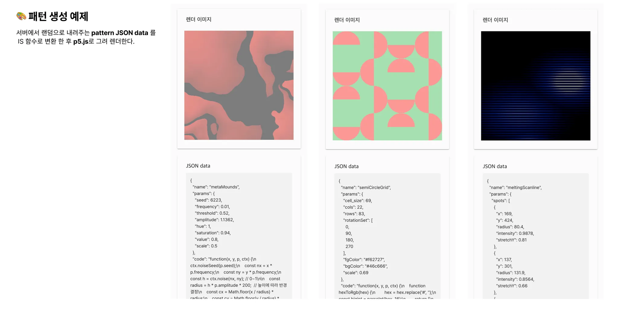 | 서버 | 패턴 타입 선택, 랜덤 파라미터 생성, 렌더링 알고리즘(JS 코드 등) 제공 |