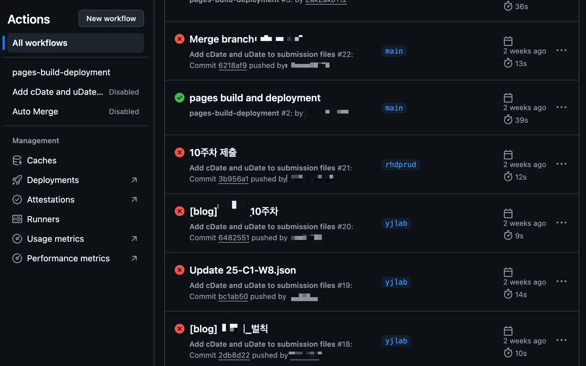 2) 첫 깃허브 제출을 시도했으나 자동화 단계에서 예상외의 오류들 다수 발생