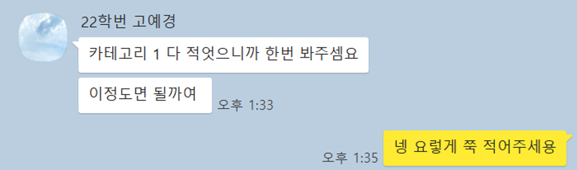 나는 이 단계에서 이용자와 개발자의 입장에서 해당 카테고리가 와닿는가? 이해가 되는가? 와 제작하기 용이한가? 를 기준으로 피드백을 드렸다.
