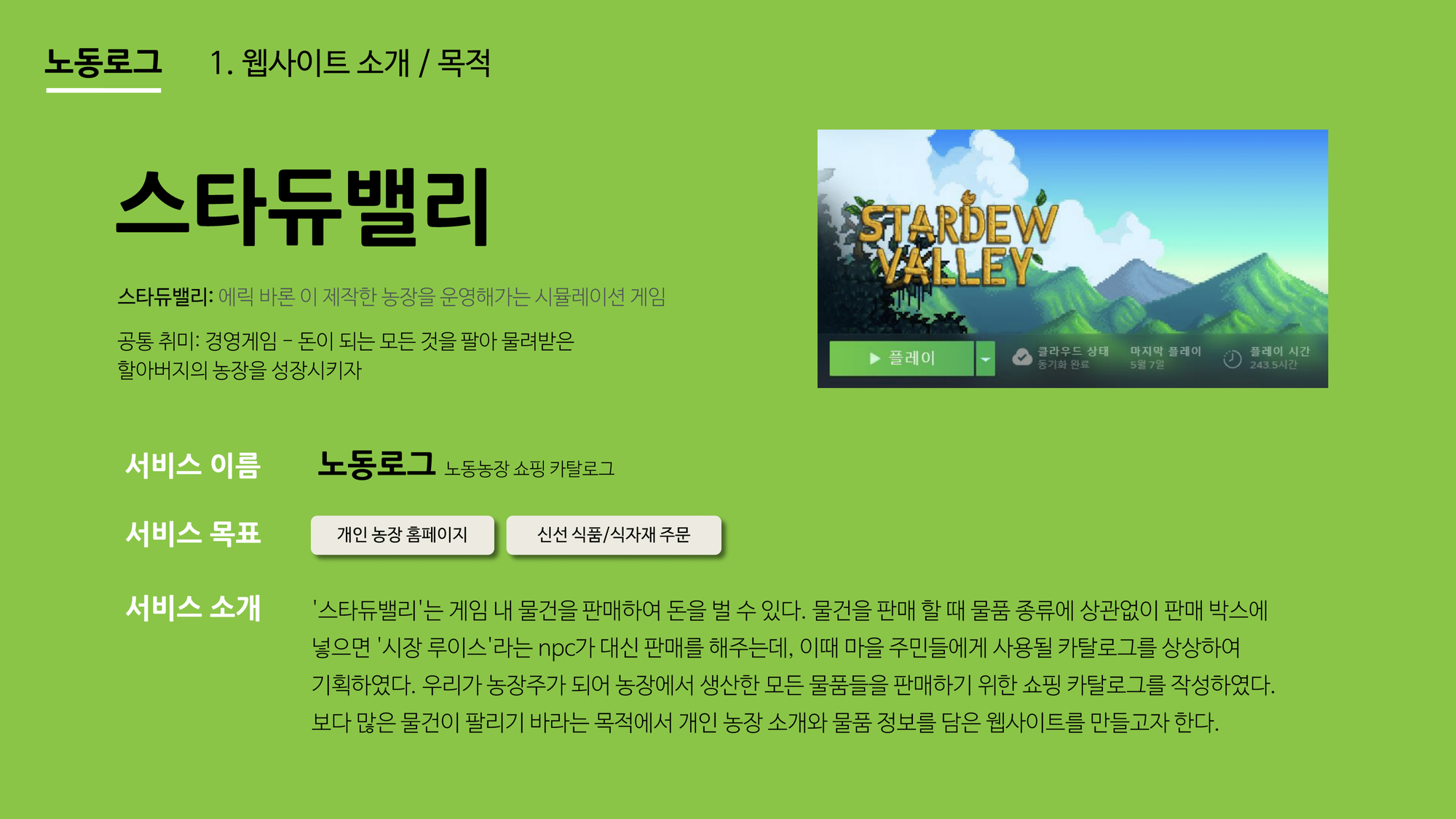 따라서 최종적으로 결정된 주제는 팀의 공통점인 경영 게임 중 '스타듀밸리를 컨셉으로 하여, 실제로 플레이한 농장 노동 농장의 쇼핑 웹사이트 노동로그를 제작하는 것으로 결정되었다.