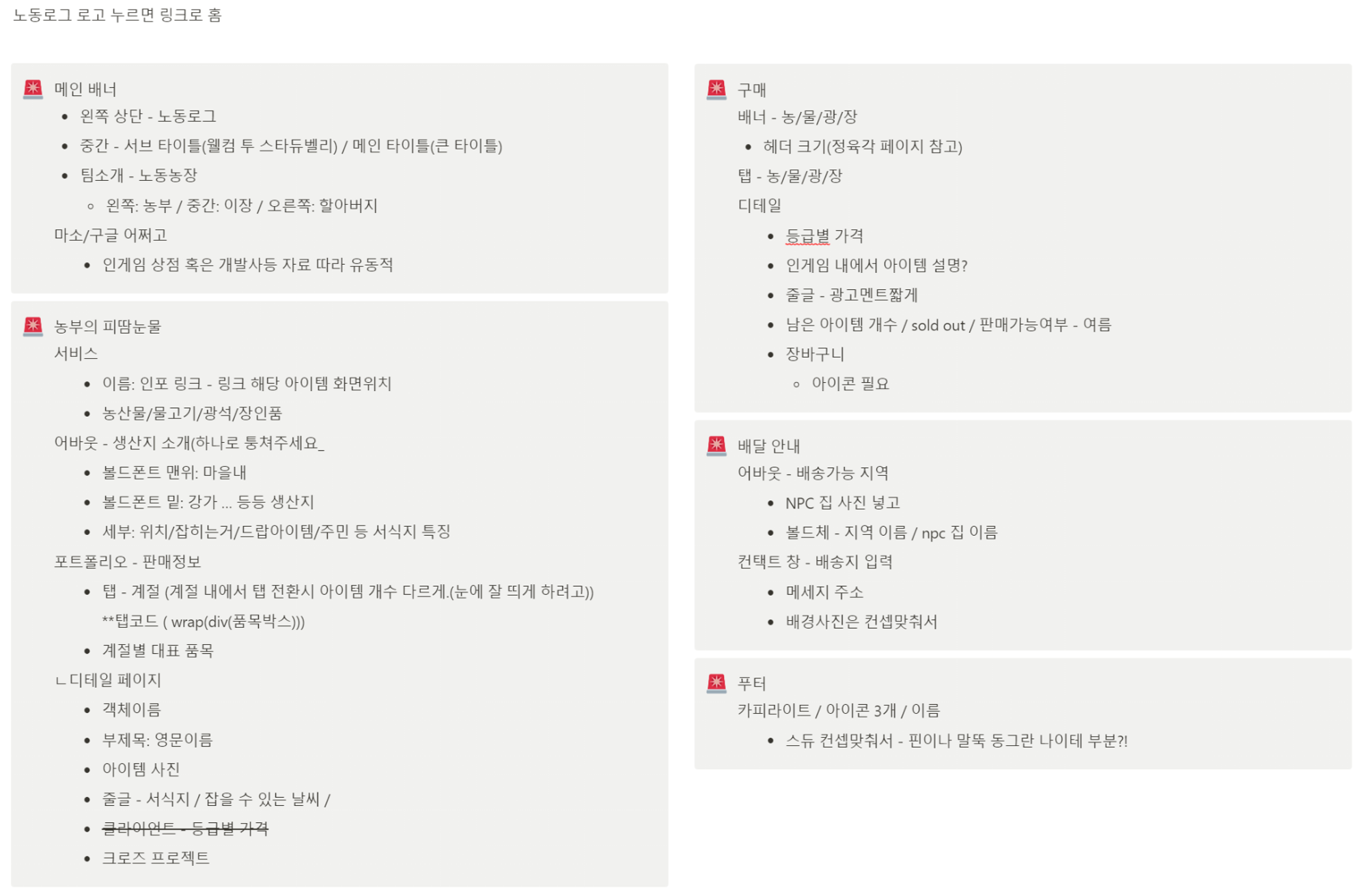 노션의 콜아웃 기능을 활용하여 각 페이지를 쪼개고, 페이지 별로 들어갈 내용들을 블럭 단위로 입력했다. 각 블럭의 내용과 활용할 템플릿 섹션을 대응시켜 기록하였다. 세부 항목으로는 입력될 컨텐츠와 고려해야 할 사항들을 작성하였다.