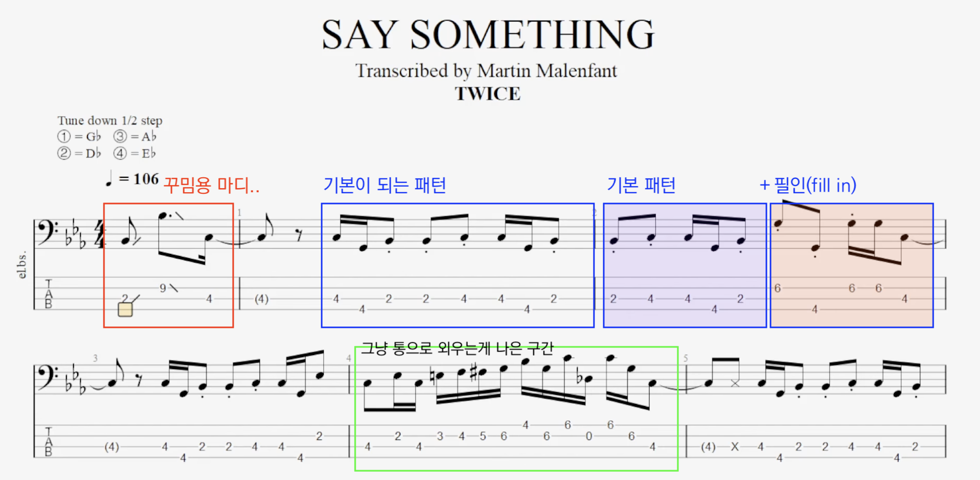 보통 벌스구간이나 프리코러스 등 빌드업 구간에서 기본 리듬이 나온다. 혹은 잡스러운 꾸밈을 걷어내고 기본 리듬을 딴 후에 근음을 쳐주면 된다. 초보들한테 시키는 근음치기/쉬운버전 악보가 이런 식으로 만들어진다.