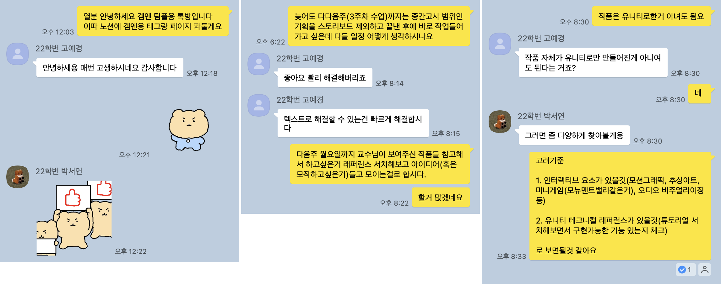 나는 2022년도에 게임엔진2를 먼저 수강하고 2023년도에 2의 선수강 과목인 게임엔진1로 되돌아와 수강하던 중이었다. 따라서 팀원 중 이미 동일한 플롯의 프로젝트를 경험했던 내가 팀리더를 담당하게 되었다.